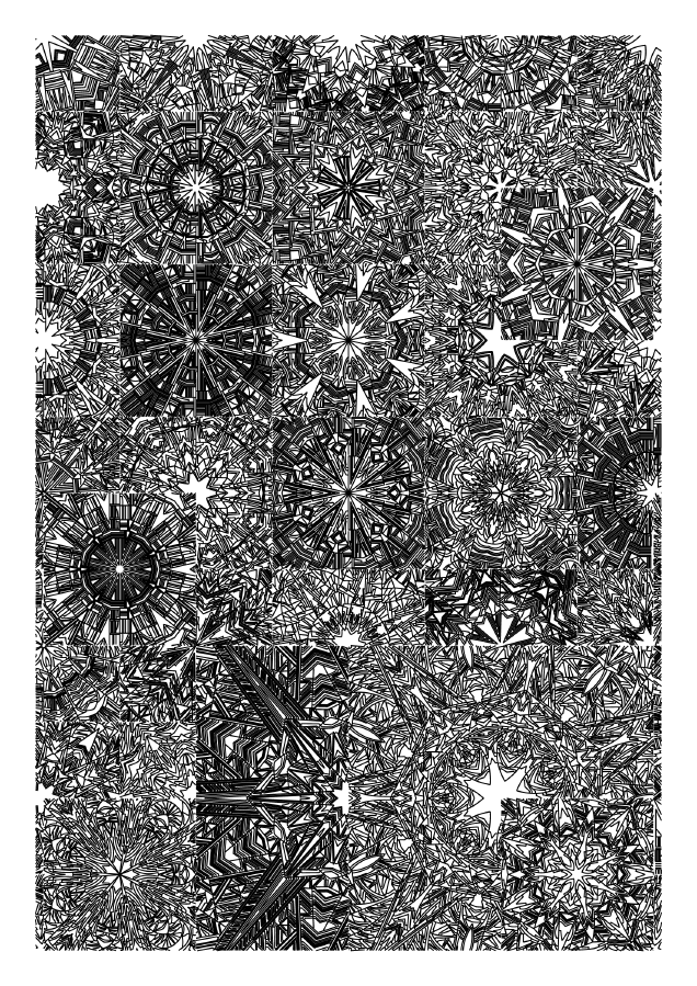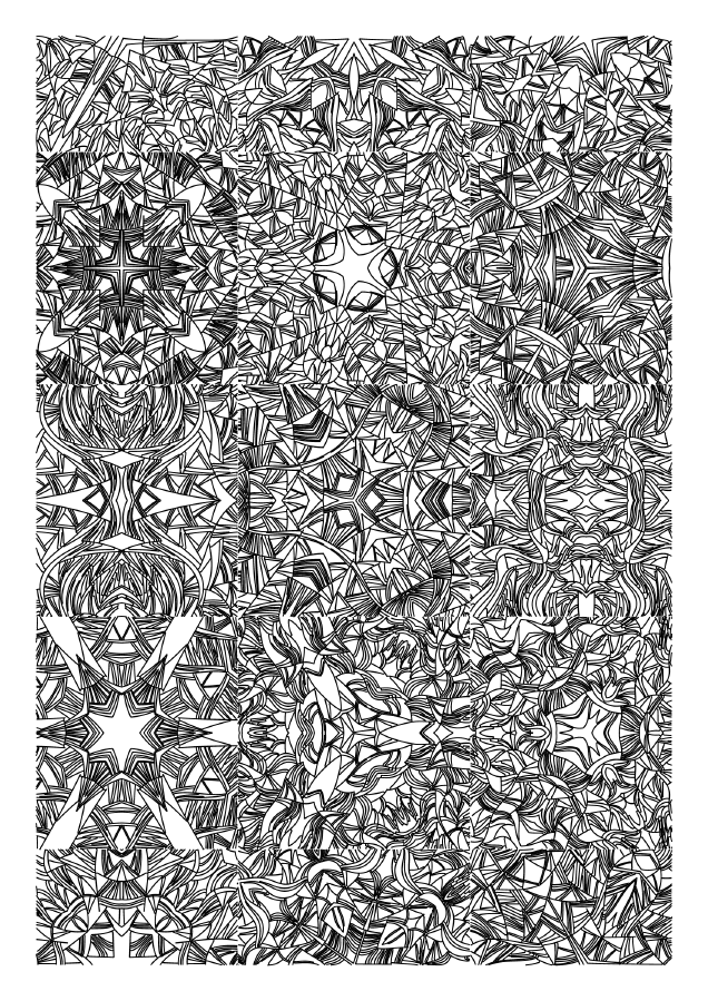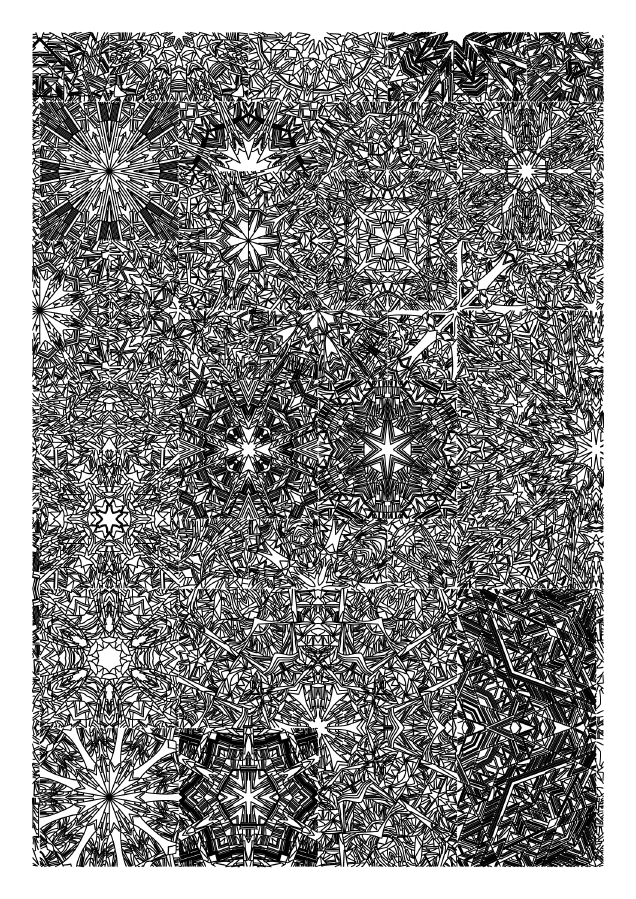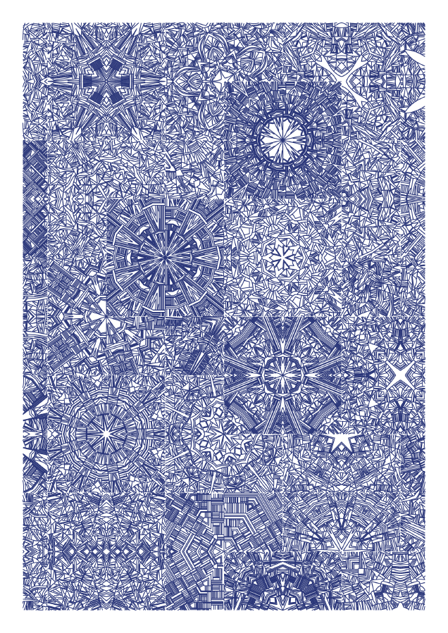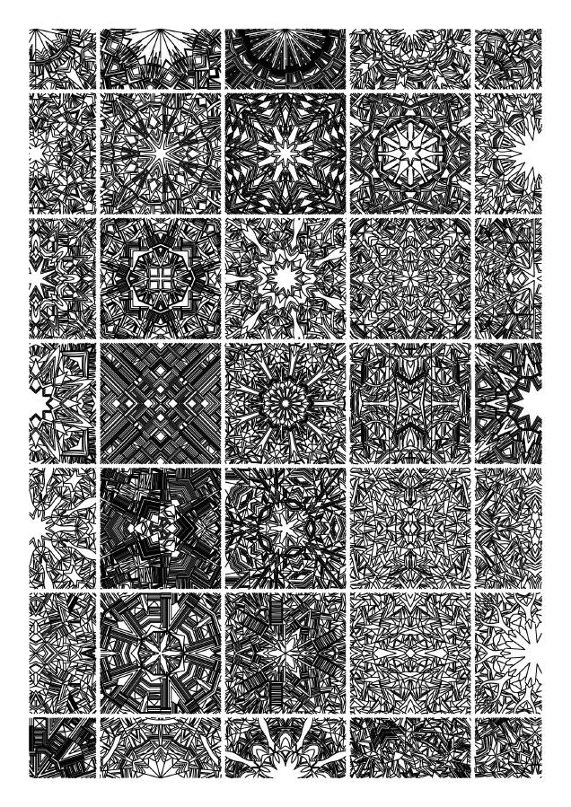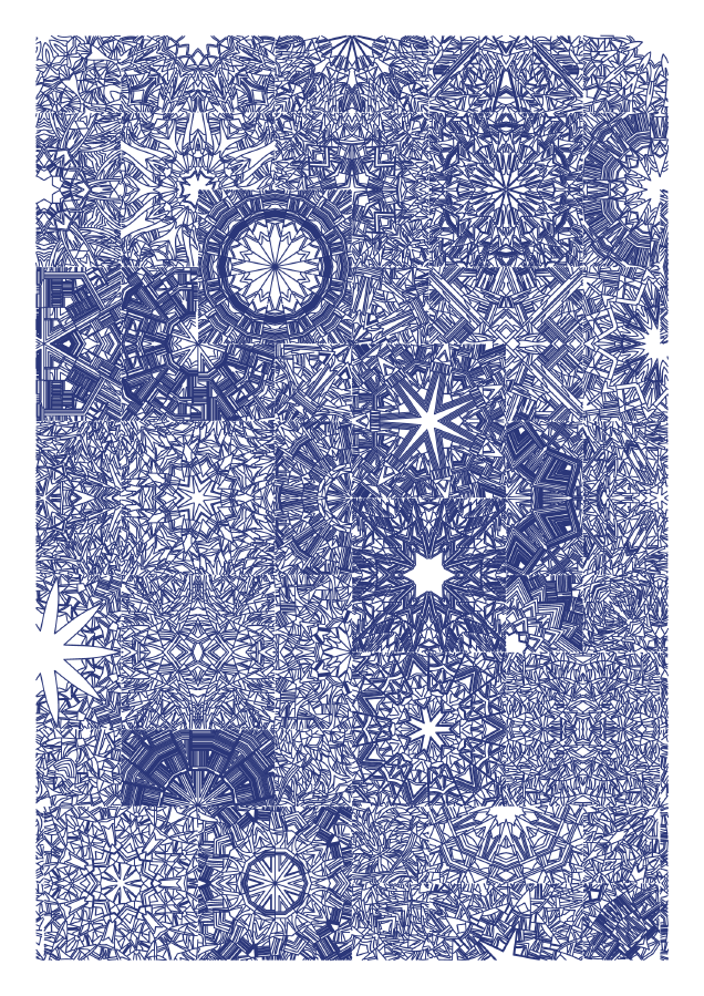 I have been playing with this algorithm for roughly a year, experimenting with different arrangments, tile patterns, and plotting settings. It started with a series of mandala-like arrangements.