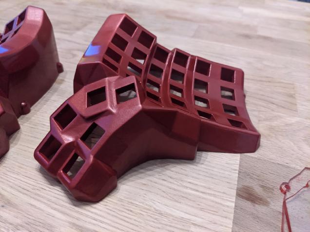 After 24h of drying, I applied multiple coats of metallic red spray paint. I also learned the important lesson of not trying to spray paint anything during the pandemic. It was impossible to buy respirators for spray painting, so I had to revert to painting really fast and outside. Doctors say that I may stop drooling before end of this year.This is why paint is uneven/dripping in a few spots.